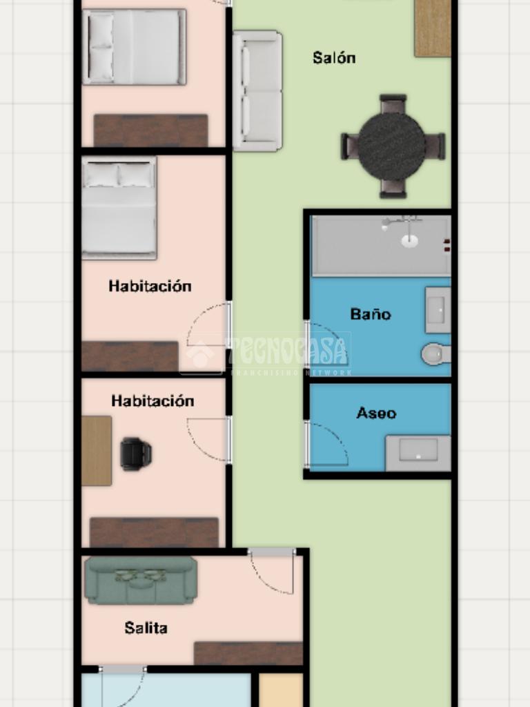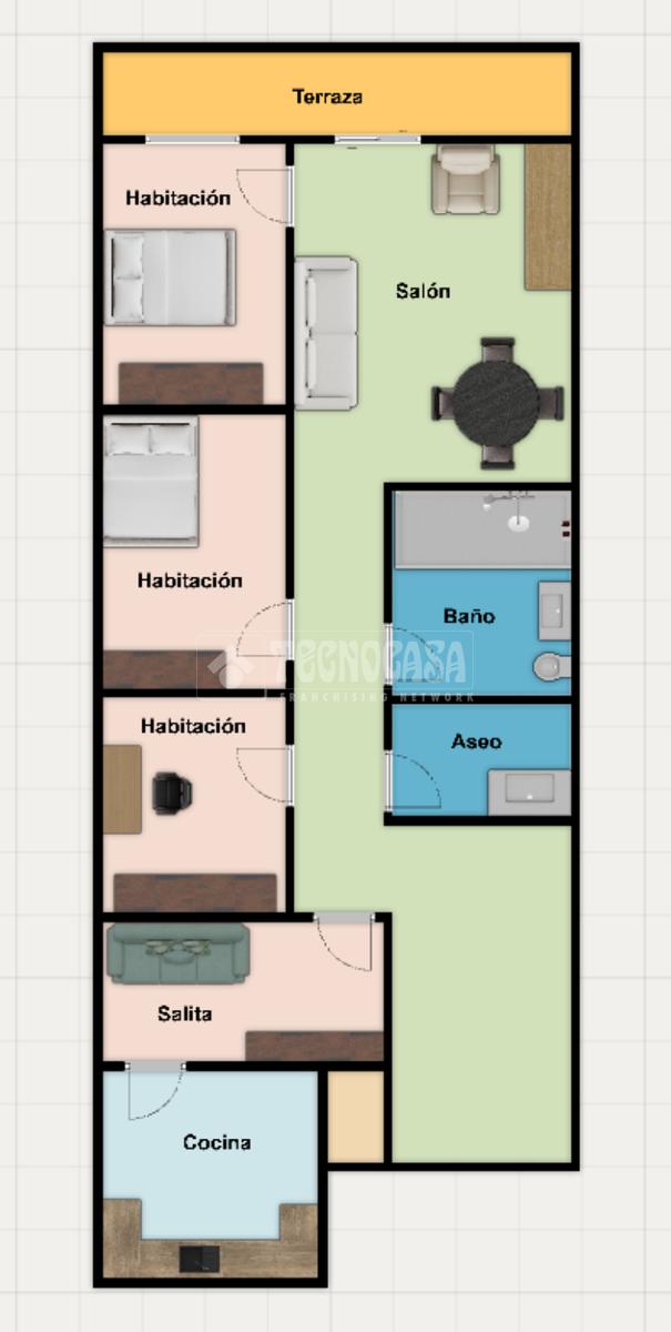 Al fondo de la vivienda se sitúa un amplio y luminoso salón, con salida directa a la terraza, además de la habitación principal.